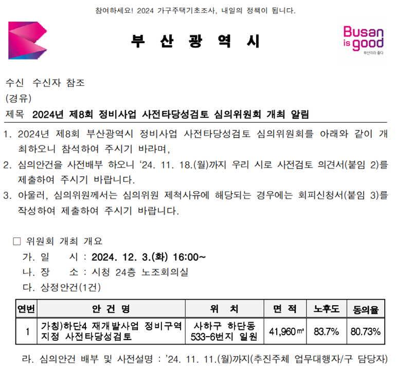 하단 4구역 사타심의 날짜는 12월 3일 화요일 입니다.