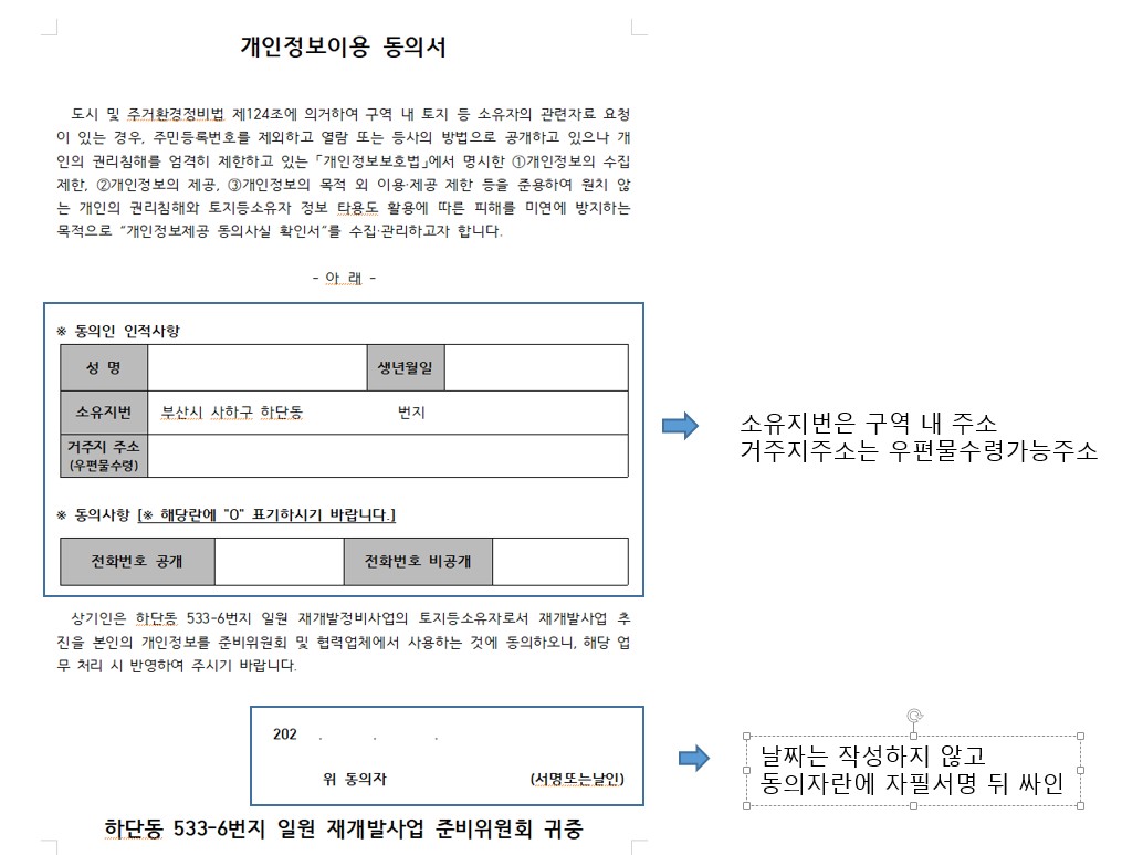 재개발의 첫 시작점은 토지등 소유자님들의 동의서 입니다 최대한 많은 동의서를 징구할수 있도록 도와주세요~