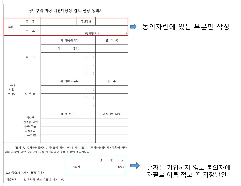 작성할서류는 정비구역지정 사전 타당성 검토 신청서와 개인정보동의서서식