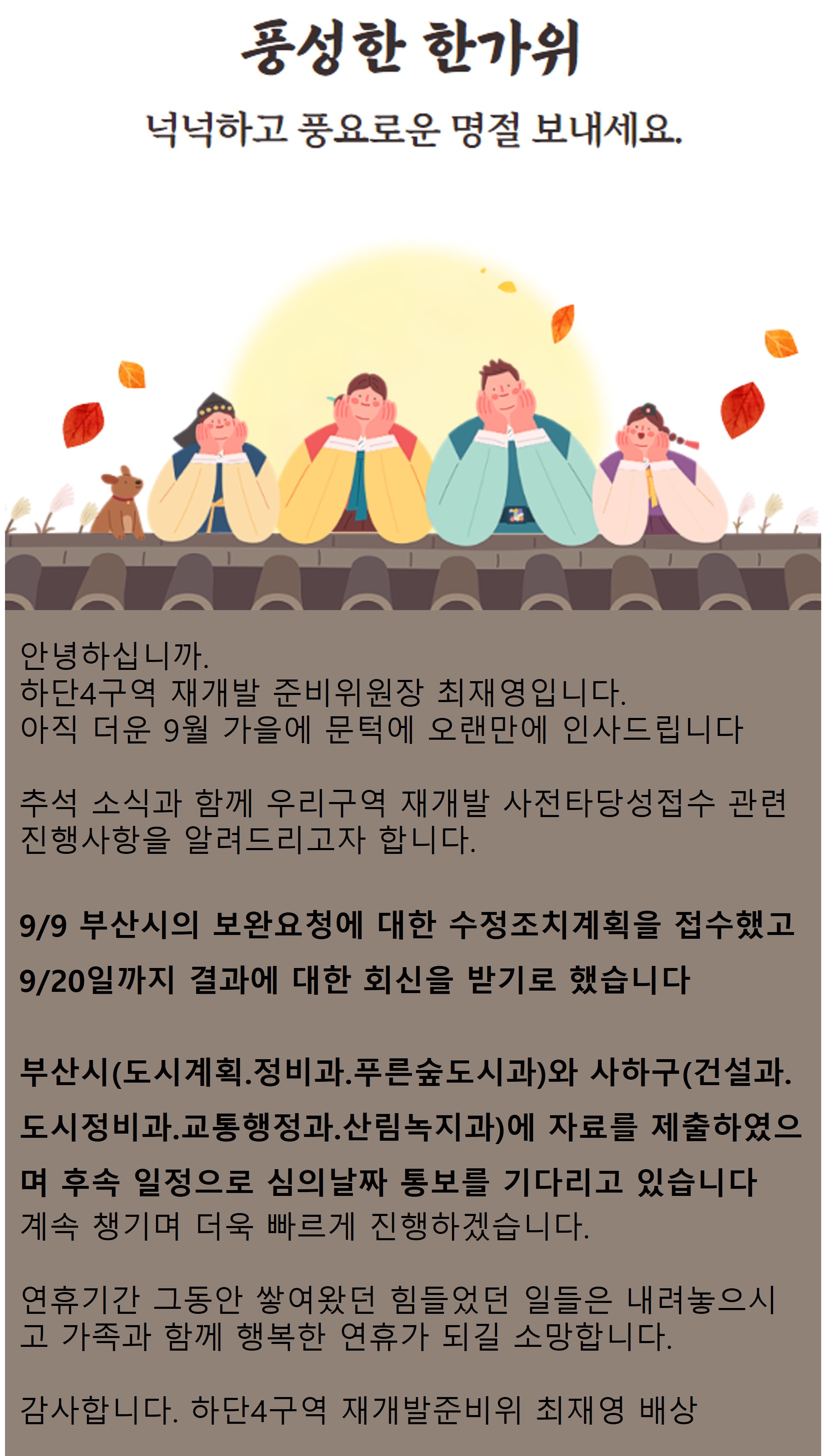 카테고리 없음 '24 추석인사 및 진행사항 공유드립니다. 비젼사하 뉴하단 2024. 9. 13. 21:57 가칭하단4구역 재개발 준비위 '24년 추석인사 및 진행사항 공유 https://band.us/band/89694171/post/49 저작자표시 (새창열림)