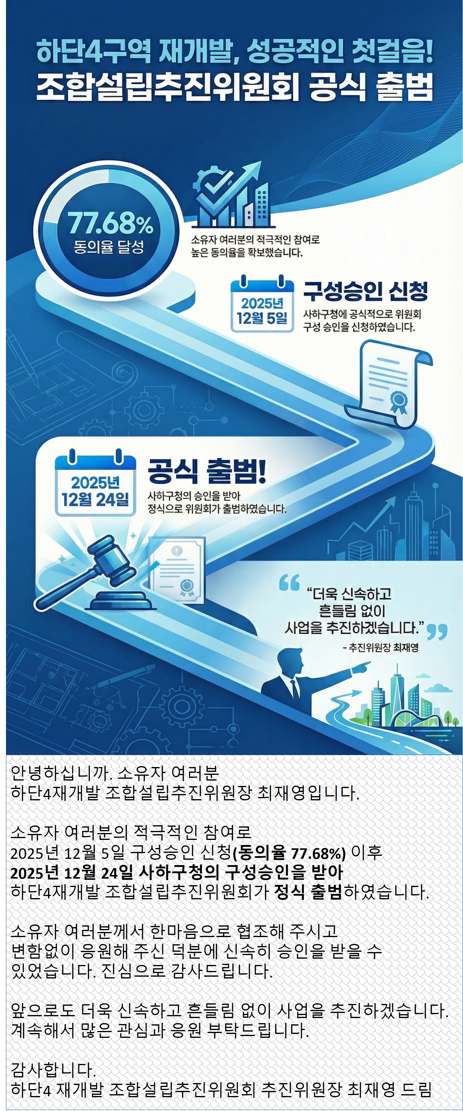카테고리 없음 [공지] 하단4 재개발 조합설립추진위 승인!!! 비젼사하 뉴하단 2025. 12. 28. 12:03 안녕하십니까. 직함이 변경되어 새로 인사드립니다. 하단4 재개발추진위원장 최재영 인사드립니다. 저작자표시 (새창열림)